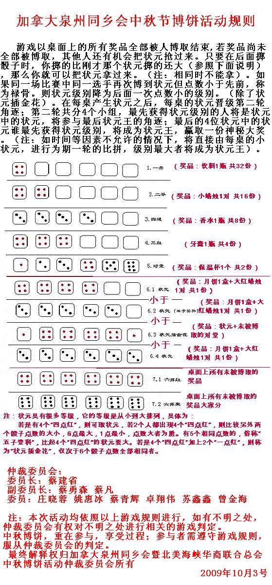 加拿大泉州同乡会中秋节博饼活动规则  10/3/2009