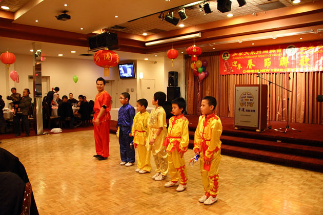 新春晚会上,理事王冠群带领武术队小队员参加才艺表演  2/12/2013