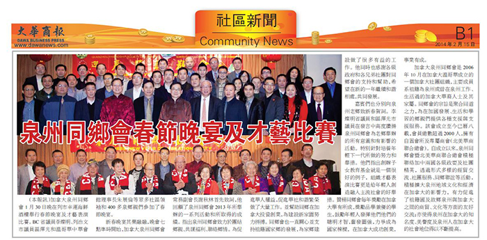 《大华商报》报道:加拿大泉州同乡会1月30日晚在列市幸运海鲜酒楼举行春节晚宴及才艺表演比赛。BC省议员李灿明、列治文市议员区泽光和温哥华中华会馆理事长朱展伦等众多社区领袖和400多泉州乡亲们参加了春节晚宴。