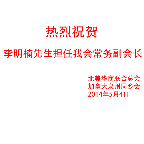 热烈欢迎李明楠先生担任我会常务副会长  5/4/2014