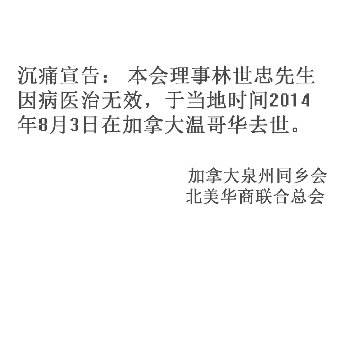 沉痛悼念本会理事林世忠先生  8/3/2014