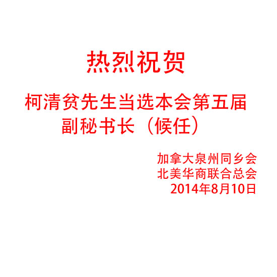 热烈祝贺柯清贫先生当选加拿大泉州同乡会第五届副秘书长(候任)  8/10/2014