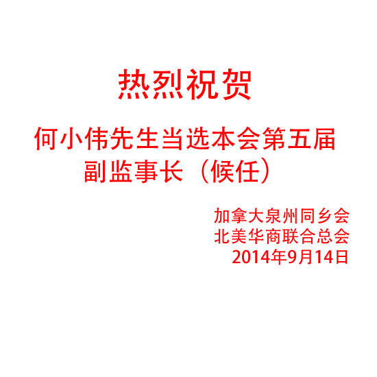 热烈祝贺何小伟先生当选加拿大泉州同乡会第五届副监事长(候任)  9/14/2014