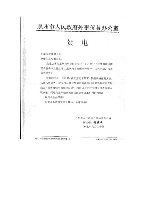 泉州市侨办发来贺信一  10/7/2007