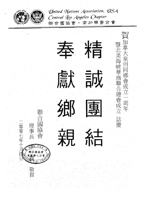 联合国协会南加华裔分会发来贺信  10/7/2007