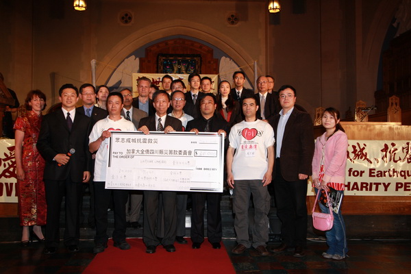 6月6日晚,副会长郭亚欣(Allan Guo)率领部分同乡会会员参加“让世界充满爱”义演。当晚,泉州同乡会捐款7000多元给四川灾区。图为郭副会长(前排右三)在捐赠仪式上。