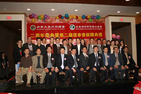 2008年10月4日晚,泉州同乡会/北美海峡华商联合总会第二届理事会就职典礼仪式在“粤之醉”海鲜酒家隆重举行。图为同乡会会长、名誉会长、秘书长、副秘书长、监事长、副监事长及各位理事在就职仪式上合影。