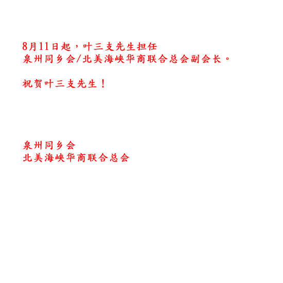 热烈欢迎叶三支先生担任同乡会副会长  8/14/2010