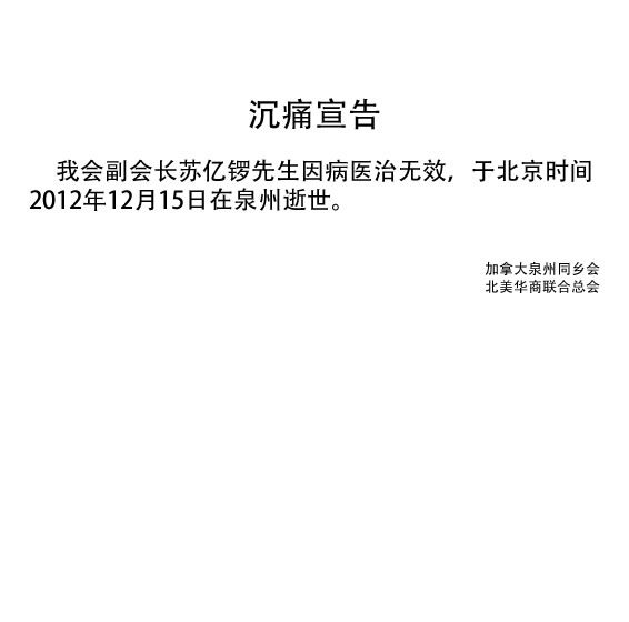 沉痛悼念我会副会长苏亿锣先生  12/16/2012